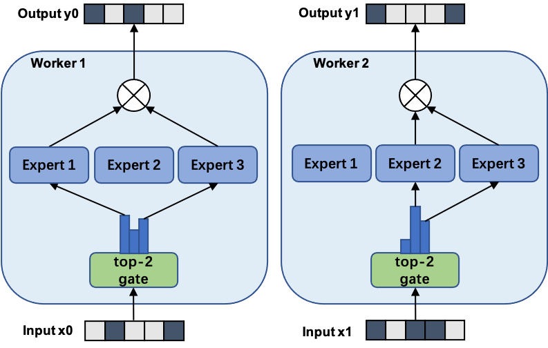 The following figure shows the forward pass of a 6-expert MoE with 2-way model parallel. Note that experts 1-3 are located in worker 1 while experts 4-6 are located in worker 2.
