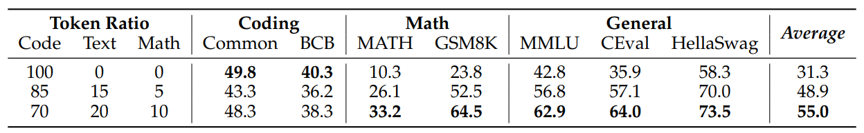对5种类型的数据进行混合来训练一个foundational model,Qwen2.5-Coder尝试了多种混合比例,最后选择的混合比例为:Code:Text:Math=7:2:1,共5.2T的Tokens: