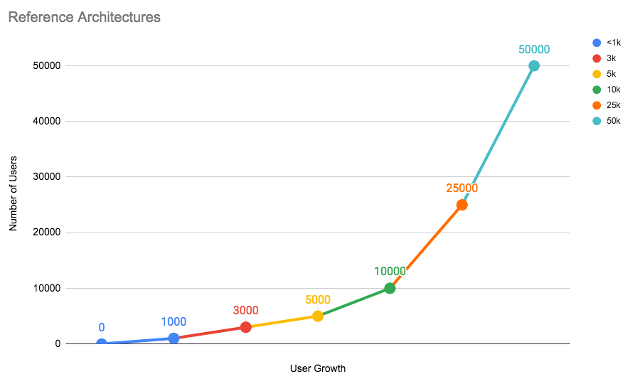 Below is a chart representing each architecture tier and the number of users they can handle. As your number of users grow with time, it's recommended that you scale GitLab accordingly.