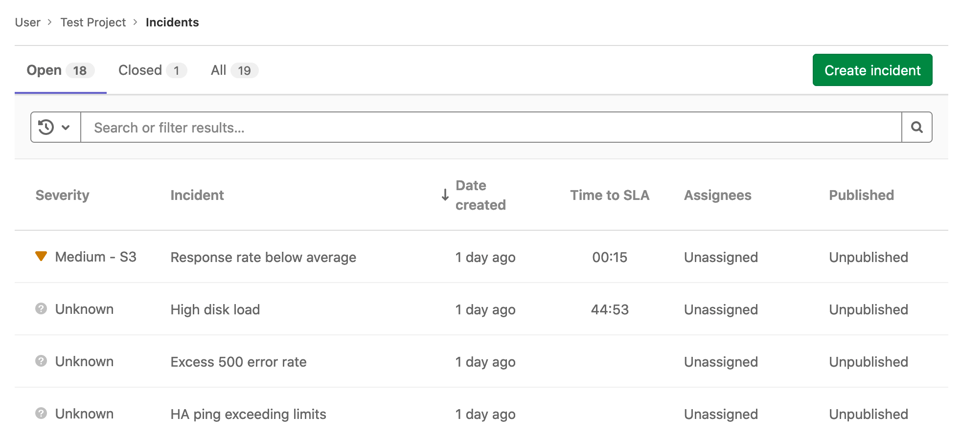 For users with at least Guest permissions, the Incident list is available at Monitor > Incidents in your project's sidebar. The list contains the following metrics: