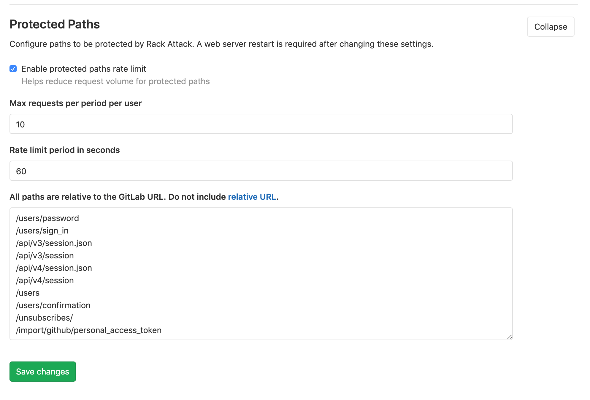 GitLab rate limits the following paths with Rack Attack by default: