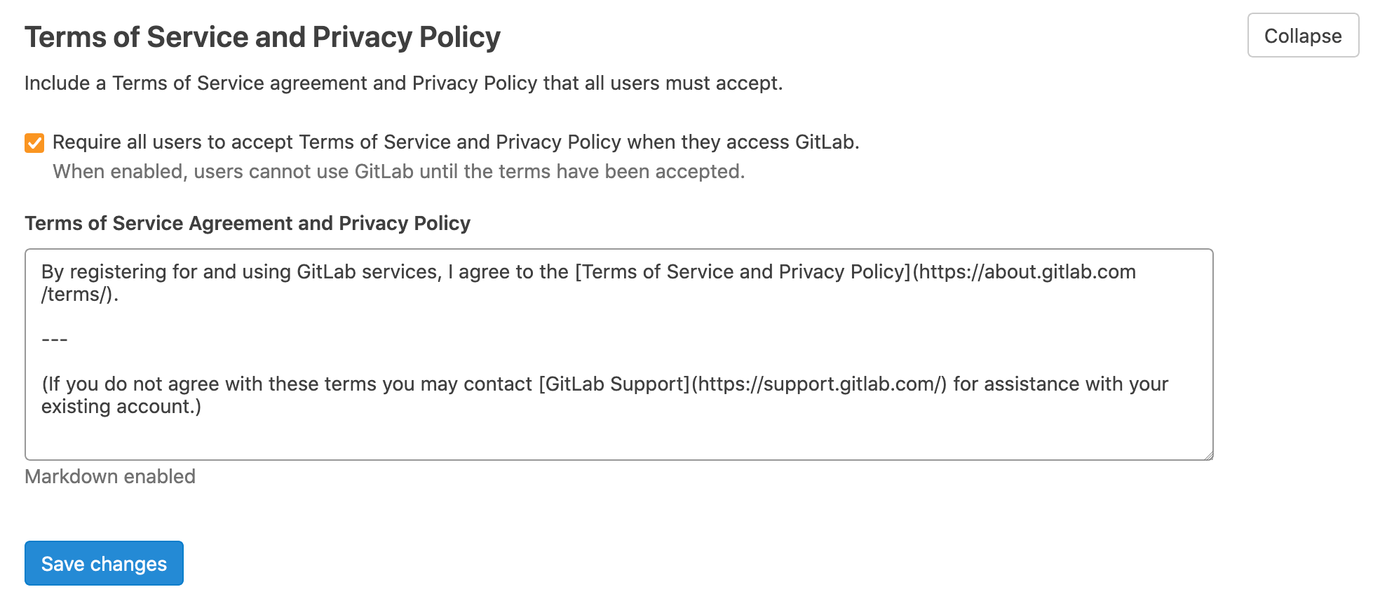 - Check the Require all users to accept Terms of Service and Privacy Policy when they access GitLab. checkbox.