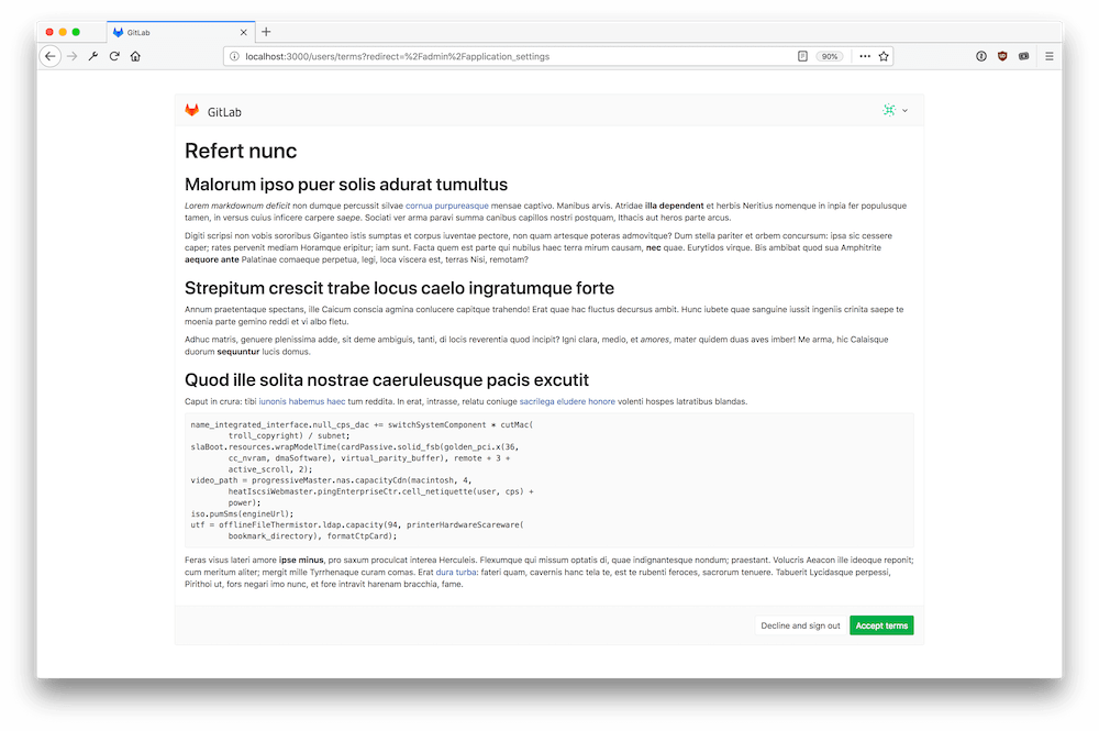 For each update to the terms, a new version is stored. When a user accepts or declines the terms, GitLab records which version they accepted or declined.
