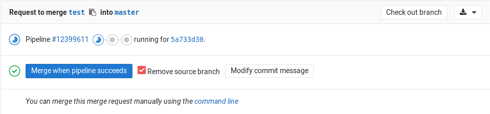 When the pipeline succeeds, the merge request is automatically merged. When the pipeline fails, the author gets a chance to retry any failed jobs, or to push new commits to fix the failure.