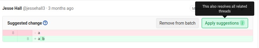 For example, consider that a user applied 3 suggestions to 2 different files, the default commit message is: Apply 3 suggestion(s) to 2 file(s)