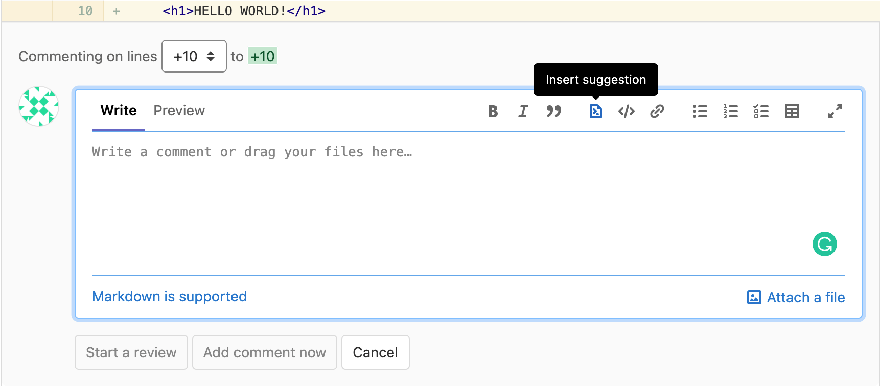 Reviewers can also suggest changes to multiple lines with a single suggestion within merge request diff threads by adjusting the range offsets. The offsets are relative to the position of the diff thread, and specify the range to be replaced by the suggestion when it is applied.