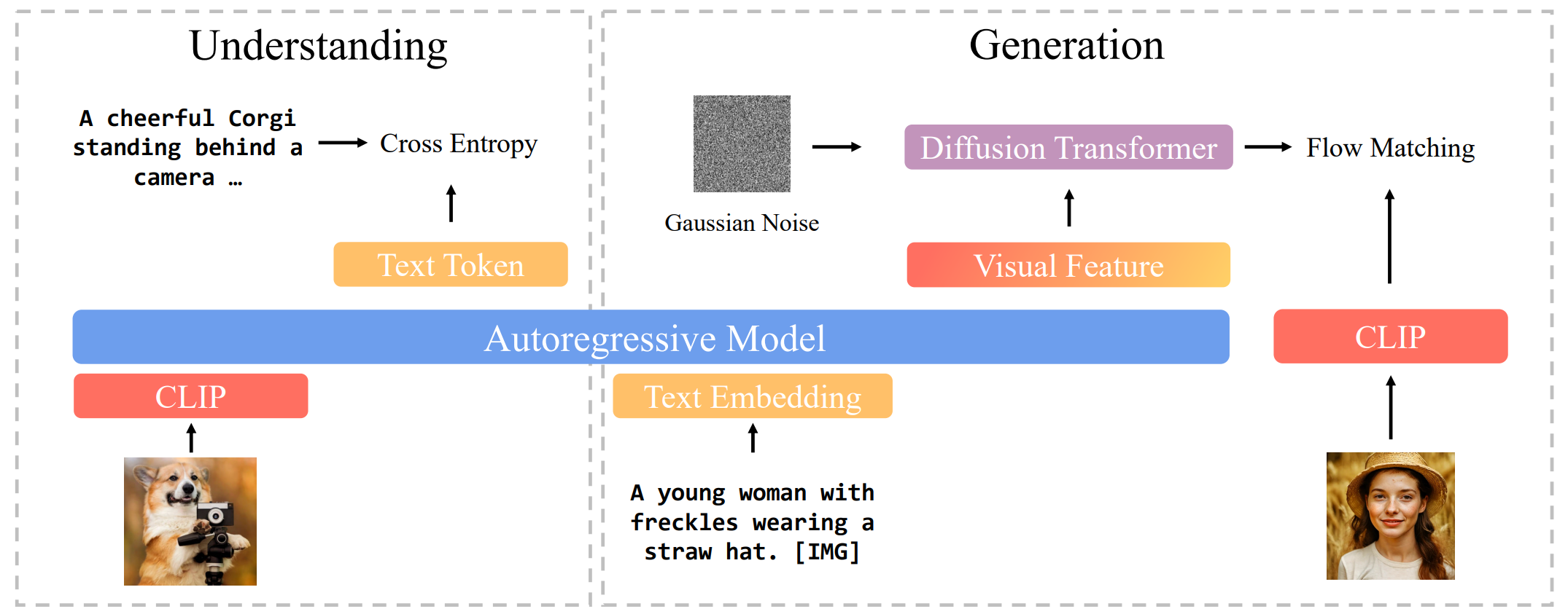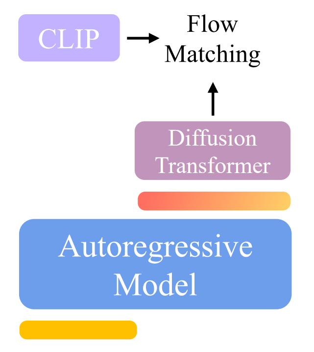 CLIP嵌入与流匹配损失相结合,CLIP特征比VAE特征产生更紧凑、语义更丰富的表示,从而提高了训练效率,流匹配被证明是对图像分布进行建模的更有效的训练目标,从而产生更大的样本多样性和更高的视觉质量。