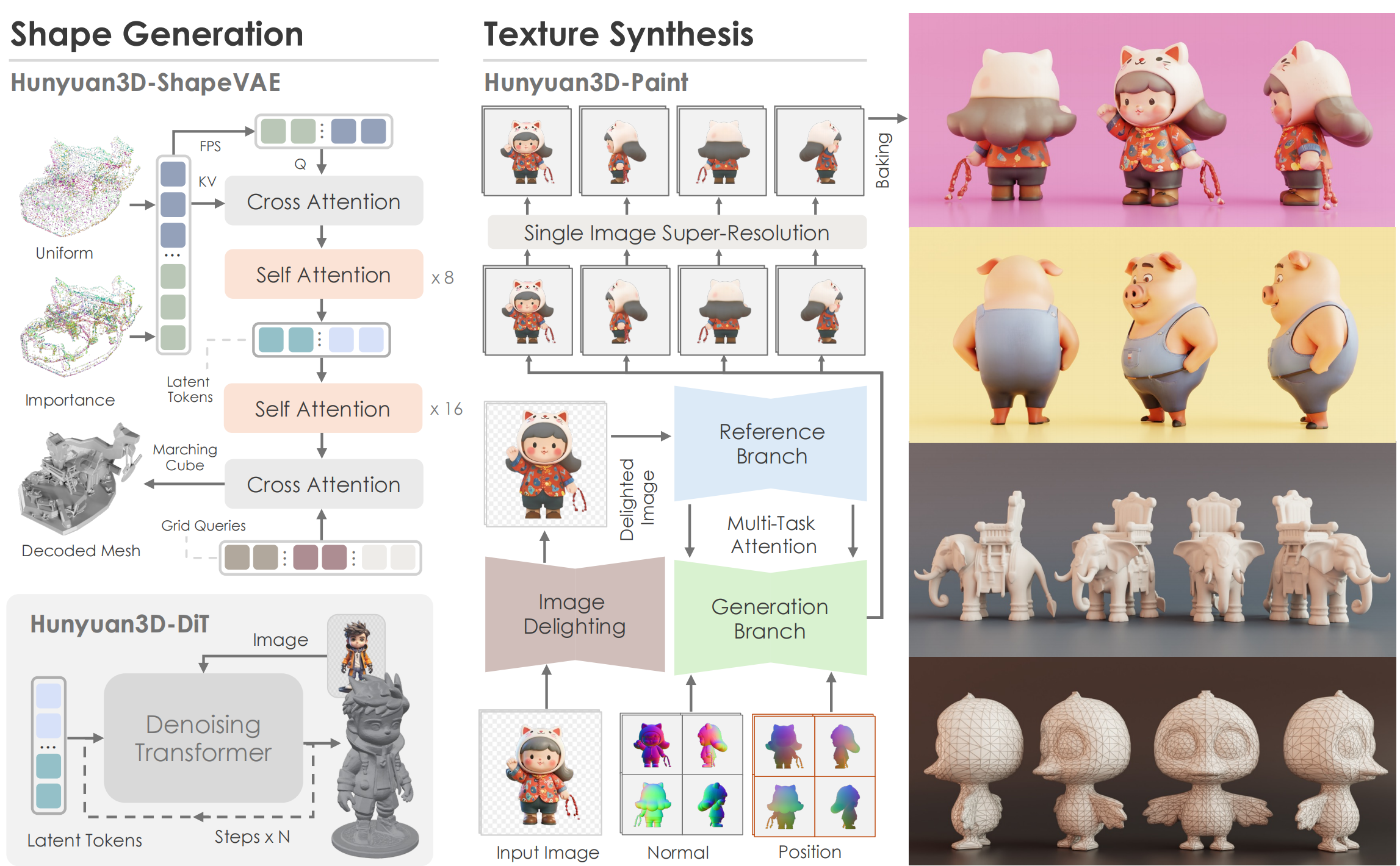 # Hunyuan3D-2 腾讯提出Hunyuan3D-2,用于生成带有高分辨率纹理贴图的高保真度3D模型。 ## 论文 `无` - 技术文档参考:[Hunyuan3D 2.0: Scaling Diffusion Models for High Resolution Textured 3D Assets Generation](./assets/report/Tencent_Hunyuan3D_2_0.pdf ) ## 模型结构 Hunyuan3D-DiT采用了具有双流和单流块的 transformer 架构,是一种基于流的扩散模型,旨在根据给定的图像提示生成高保真和高分辨率的3D形状。