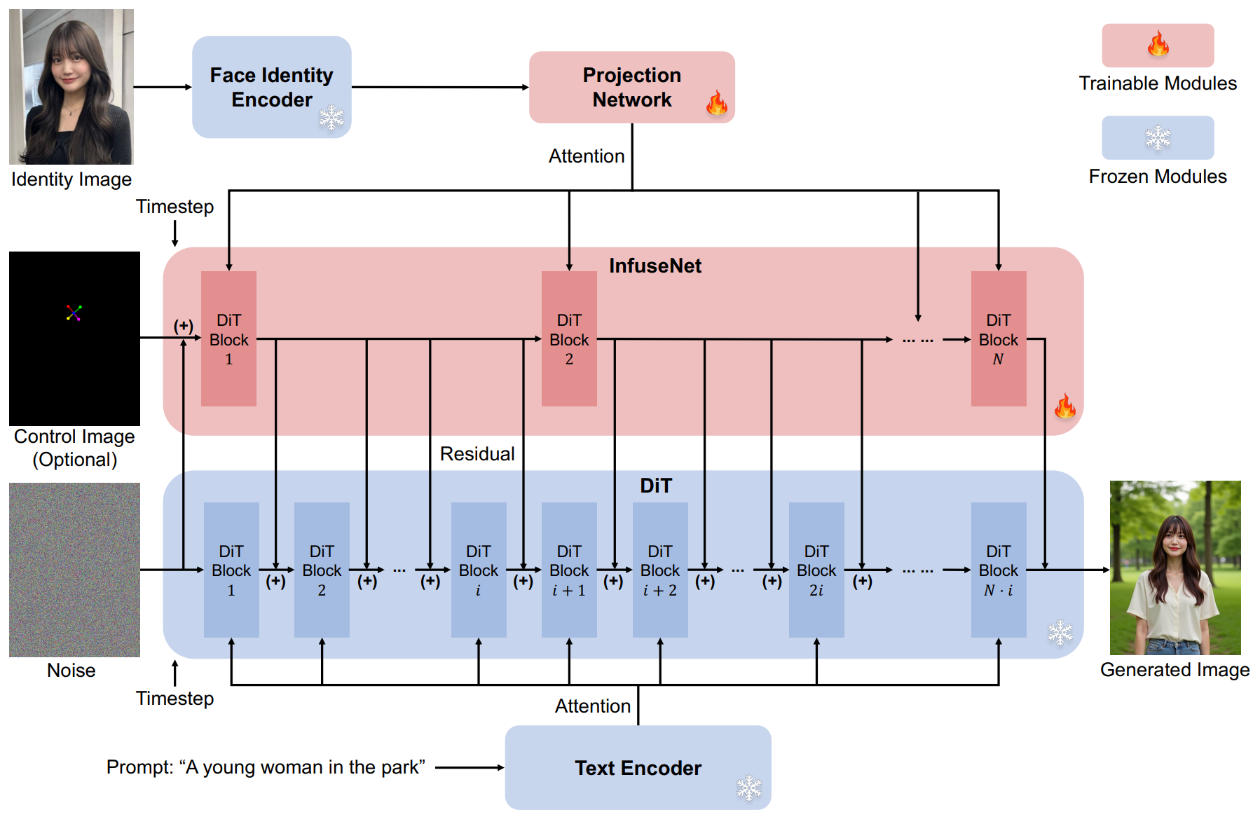 利用InfuseNet的残差连接将身份特征注入DiT基础模型,增强了身份相似性,同时保持生成能力。
