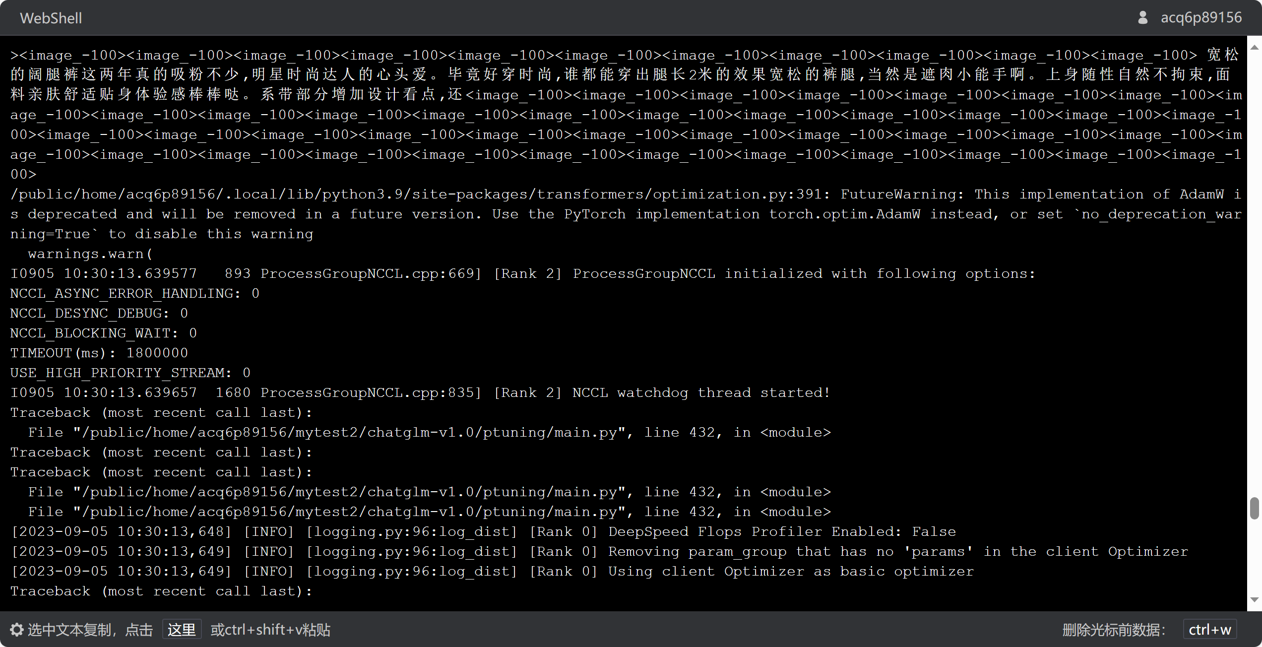 File "/public/home/acq6p89156/mytest2/chatglm-v1.0/ptuning/trainer.py", line 1704, in _inner_training_loop deepspeed_engine, optimizer, lr_scheduler = deepspeed_init(deepspeed_engine, optimizer, lr_scheduler = deepspeed_init( File "/public/home/acq6p89156/.local/lib/python3.9/site-packages/transformers/deepspeed.py", line 378, in deepspeed_init