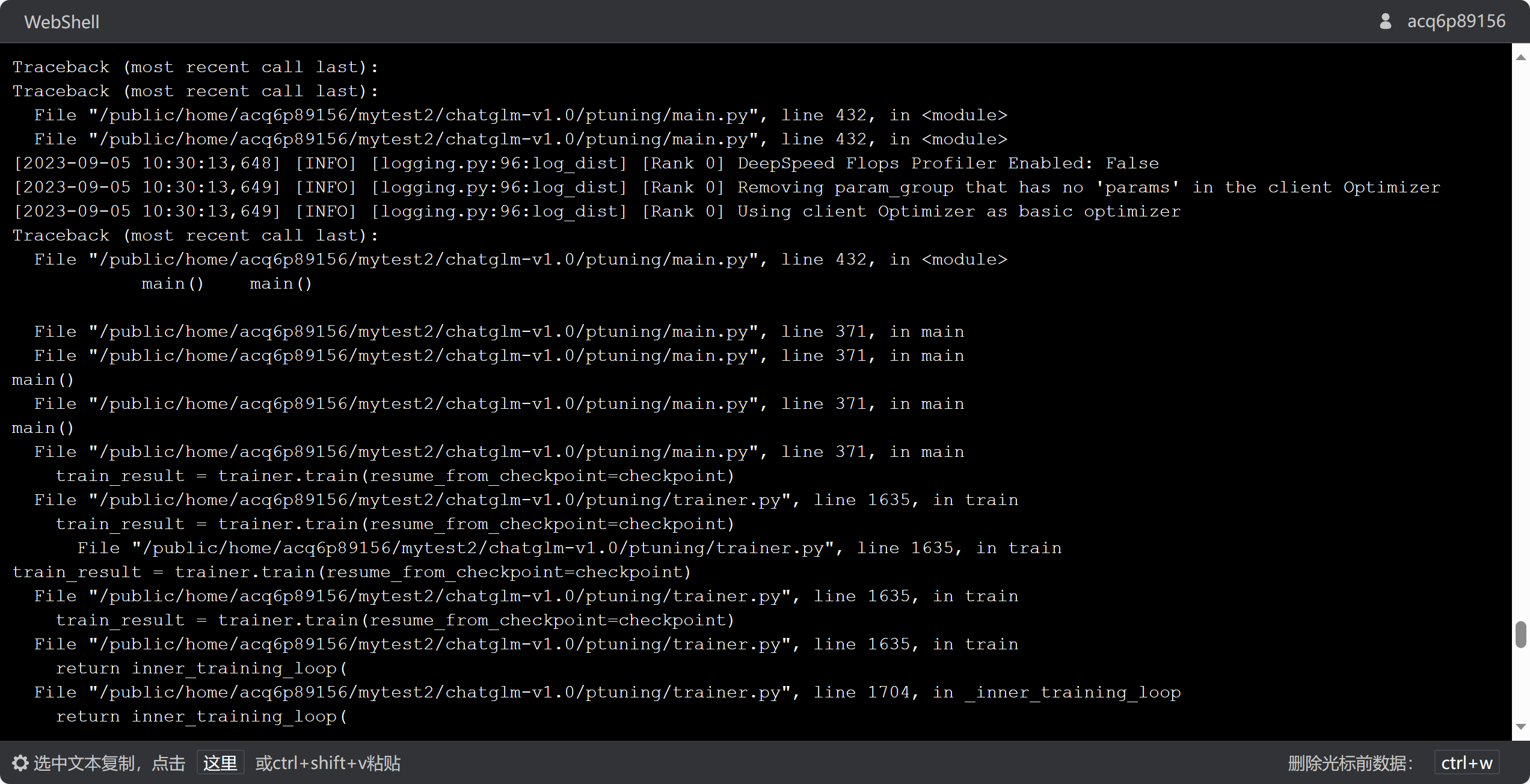File "/public/home/acq6p89156/mytest2/chatglm-v1.0/ptuning/main.py", line 371, in main train_result = trainer.train(resume_from_checkpoint=checkpoint) File "/public/home/acq6p89156/mytest2/chatglm-v1.0/ptuning/trainer.py", line 1635, in train train_result = trainer.train(resume_from_checkpoint=checkpoint) File "/public/home/acq6p89156/mytest2/chatglm-v1.0/ptuning/trainer.py", line 1635, in train train_result = trainer.train(resume_from_checkpoint=checkpoint) train_result = trainer.train(resume_from_checkpoint=checkpoint) File "/public/home/acq6p89156/mytest2/chatglm-v1.0/ptuning/trainer.py", line 1635, in train