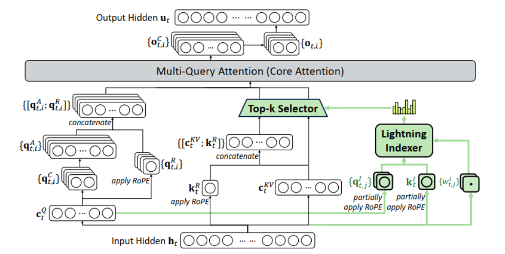 DeepSeek 稀疏注意力机制(DSA)首次实现了细粒度的稀疏注意力,在保持几乎相同的模型输出质量的同时,显著提高了长上下文训练和推理效率。