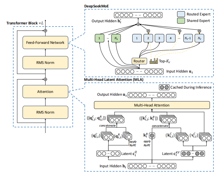 DeepSeek-V2仍然采用Transformer架构,其中每个Transformer块由一个注意力模块和一个前馈网络(FFN)组成。然而,对于注意力模块和FFN,都设计和采用了创新架构。对于注意力机制,设计MLA,它利用低秩K-V联合压缩来消除推理时间K-V缓存的瓶颈,从而支持高效推理。对于FFN,采用DeepSeek MoE架构,这是一种高性能的MoE架构,能够以经济的成本训练出强大的模型。下图展示了DeepSeek-V2的架构:其中MLA 通过显著减少生成的 KV 缓存来确保高效推理,而 DeepSeek MoE 通过稀疏架构以经济的成本训练出强大的模型。