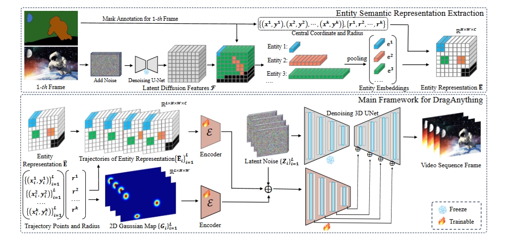 DragAnything 算法沿用 SVD 框架,主要由三个组件组成:一个去噪扩散模型(3D U-Net),用于学习空间和时间效率的去噪过程,一个编码器和一个解码器,用于将视频编码为潜在空间并将去噪后的潜在特征重建回视频中。\