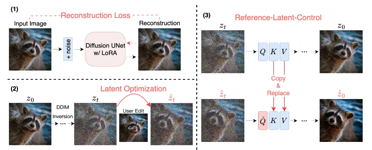 (1)先通过LoRA微调SD模型,数据集为用户输入的图像。目的是在编辑过程中(其实也是生成过程)更好的保留输入图像中物体和风格特征。\
