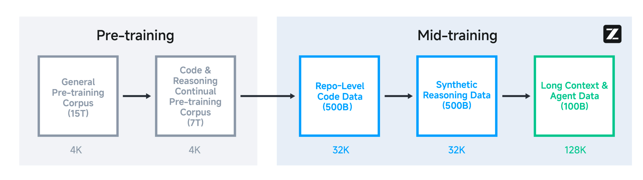 我们的基础模型经历了几个训练阶段。在预训练期间,模型首先在 15T token 的通用预训练语料库上训练,然后在 7T token 的代码和推理语料库上训练。预训练后,我们引入了 Mid-Training 阶段来进一步提升模型在专有领域上的性能。
