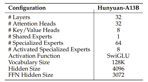 # Hunyuan-A13B ## 论文 [Hunyuan-A13B Technical Report](https://github.com/Tencent-Hunyuan/Hunyuan-A13B/blob/main/report/Hunyuan_A13B_Technical_Report.pdf) ## 模型结构 Hunyuan-A13B 具备以下特点: - 小参数量,高性能: 仅激活130亿参数(总参数量800亿),即可在多样化基准任务中媲美更大规模模型的竞争力表现 - 混合推理支持: 同时支持快思考和慢思考两种模式,支持用户灵活选择 - ​超长上下文理解: 原生支持256K上下文窗口,在长文本任务中保持稳定性能 - 增强Agent能力: 优化Agent能力,在BFCL-v3、τ-Bench、C3-Bench等智能体基准测试中领先 - 激活专家数: 8 - 高效推理: 采用分组查询注意力(GQA)策略,支持多量化格式,实现高效推理。 关键超参数如下: