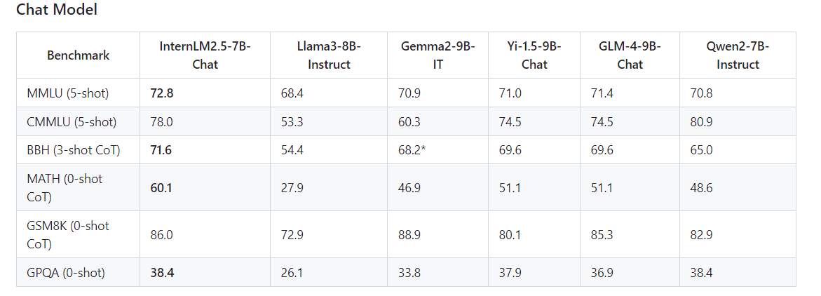 ## 算法原理 Internlm2.5主要是更新了7B系列的Chat模型。其中InternLM2.5-7B-Chat-1M模型支持百万长度的上下文窗口。主要核心点有三个:(1)卓越的模型推理能力,在数学推理的任务上达到了SOTA,超过了同等规模参数量的其他模型,如LLaMA3-8B和Gemma-9B;(2)支持百万长度上下文长度的推理,并且可以通过LMDeploy快速部署,开箱即用;(3)增加了更多的应用工具的支持
