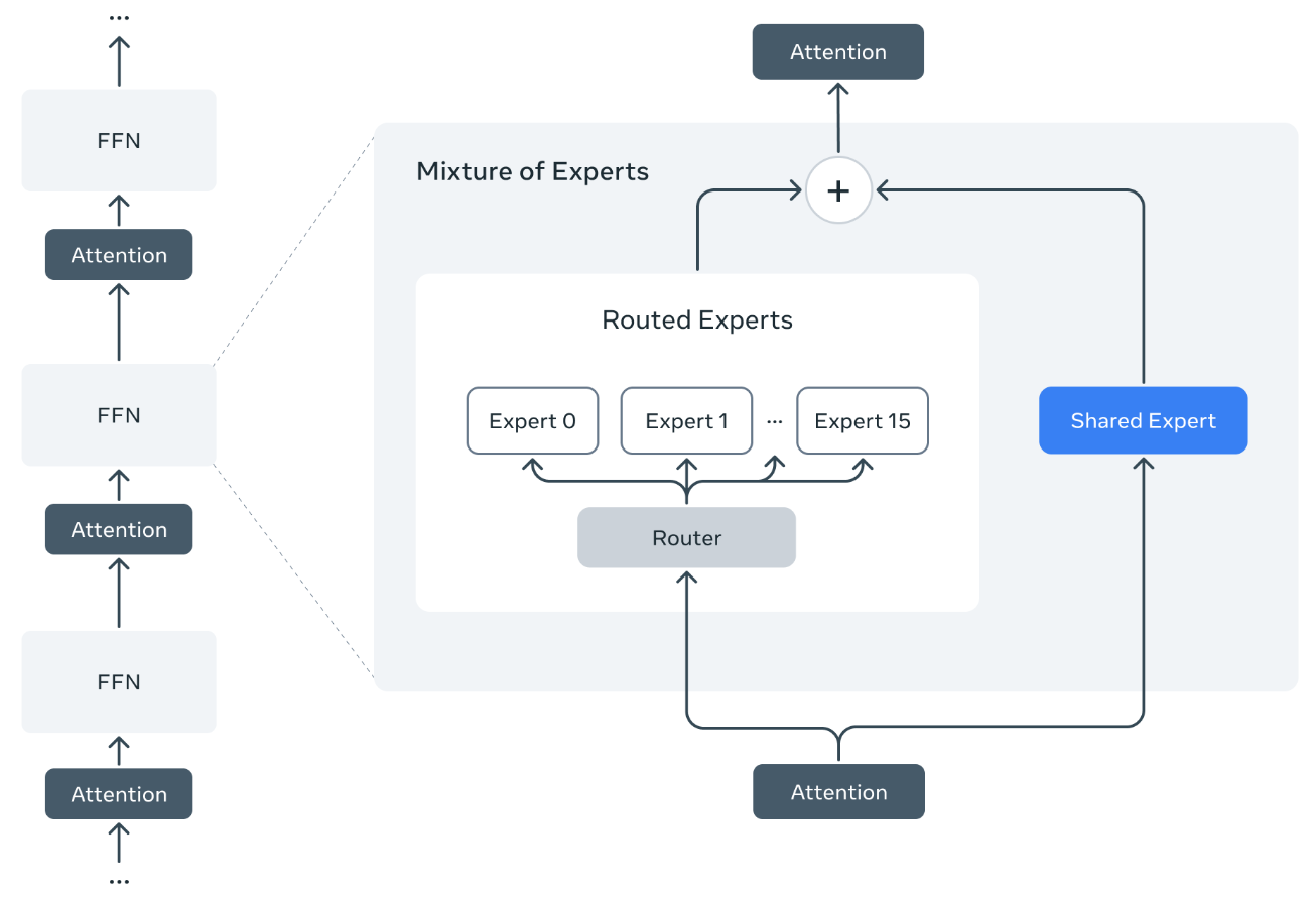 # Llama4 ## 论文 暂无 ## 模型结构 Llama 4模型是Llama系列模型中首批采用混合专家(MoE)架构的模型。这一模型也是DeepSeek系列模型采用的架构,与传统的稠密模型相比,在MoE架构中,单独的token只会激活全部参数中的一小部分,训练和推理的计算效率更高。 - Llama 4 Scout,面向文档摘要与大型代码库推理任务,专为高效信息提取与复杂逻辑推理打造,共有16位“专家”、1090亿参数、170亿激活参数量; - Llama 4 Maverick,专注于多模态能力,支持视觉和语音输入,具备顶级的多语言支持与编程能力,共有128位“专家”、4000亿参数、170亿激活参数量; - Llama 4 Behemoth,Meta未来最强大的AI模型之一,具备令人瞩目的超大规模参数架构,具有2880亿激活参数量,总参数高达2万亿。 Llama在长文本能力上也取得了突破,具有超大的上下文窗口长度。Llama 4 Scout模型支持高达1000万token的上下文窗口,刷新了开源模型的纪录,而市场上其他领先模型如GPT-4o也未能达到此规模。超大上下文窗口使Llama 4在处理长文档、复杂对话和多轮推理任务时表现出色。 ## 算法原理
