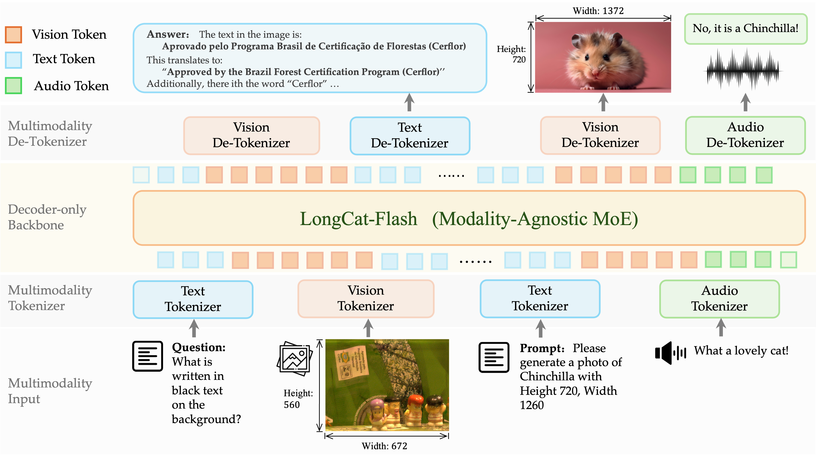 # LongCat-Next_pytorch ## 论文 [LongCat-Next Technical Report](https://github.com/meituan-longcat/LongCat-Next/blob/main/tech_report.pdf) ## 模型简介 G本工作主要通过一种强调简洁性的设计理念来解决原生多模态的根本障碍,即将视觉和音频视为语言的内在延伸。作为实现这一目标的重要一步,我们提出了 LongCat-Next——一个离散原生多模态模型,它在离散框架内实现了工业级性能,同时在众多专业领域保持高度竞争力。该模型基于 LongCat-Flash-Lite MoE 主干网络(A3B)作为_多任务_学习器,将语言、视觉和音频统一于单一的离散框架之中。本文的主要贡献如下: - 🌟 离散原生自回归范式(DiNA)。 我们提出了 DiNA,这是一种统一的范式,将语言中的下一个 token 预测扩展至原生多模态领域,将多种模态内化到共享的 token 空间中。该范式通过构建模态感知的分词器-反分词器对,并利用大语言模型成熟的训练基础设施,简化了多模态建模过程。 - 🌟 离散视觉表示的语义完整性。 我们通过将语义对齐编码器(Semantic-and-Aligned Encoders, SAE)与残差向量量化(Residual Vector Quantization, RVQ)相结合,改进了离散视觉建模。这种集成创建了分层的离散 token,既保留了语义抽象,又保留了细粒度的视觉细节,超越了传统表示方法的局限性。 - 🌟 离散原生分辨率视觉 Transformer(dNaViT)。 类比于语言 tokenizer,我们提出了 dNaViT,作为一种高度灵活、统一的视觉离散接口,它将语义特征提取为“视觉词”,构建了一个支持动态分词与反分词的分层表示空间。dNaViT 能无缝集成到大语言模型中,在不造成性能下降的前提下确保高性能。 - 🌟 在统一模型中实现卓越的看、创、说能力。 在 DiNA 框架内,视觉理解与生成被优雅地重新表述为同一预测过程的两种表现形式,且不牺牲性能。该表述弥合了长期以来的架构鸿沟,同时在传统上相互竞争的目标之间引入极小的干扰,并保留了核心的语言能力。值得注意的是,LongCat-Next 在理解任务上达到了与专用理解模型相当的性能,即使在 28 倍压缩率下仍保持强大的生成质量(尤其在文本渲染方面),同时在高级语音理解、低延迟语音对话和可定制语音克隆方面也表现出色。