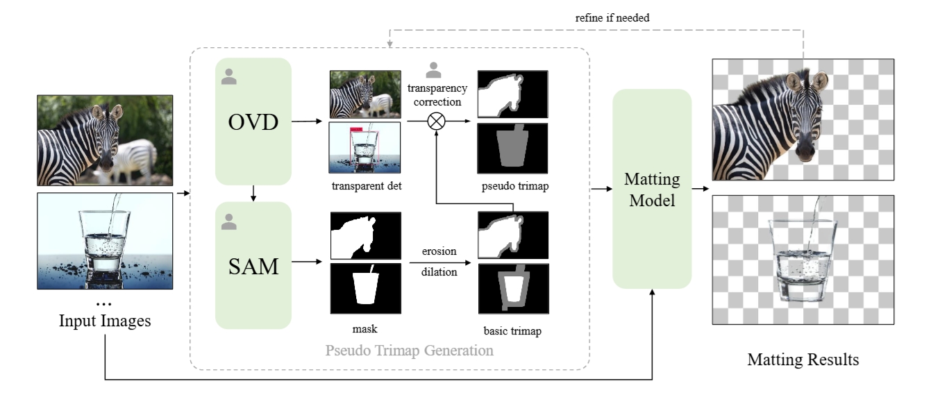 Matte-Anything 关键思想是使用视觉基础模型生成的分割和透明度信息来生成伪三元图。因此,我们将图像抠图作为图像分割和透明对象检测的下游任务。Matte-Anything 利用特定于任务的视觉模型来增强自然图像抠图的性能。首先,我们采用分段任意模型 SAM 为目标实例生成高质量的掩模。随后,我们利用开放词汇对象检测模型,即 GroudingDINO 来检测常见的透明对象。然后根据分割和透明对象检测结果生成伪三元图,随后将其输入到自然图像抠图模型中 —— ViTMatte 。 ViTMatte模型是最先进的与类别无关的抠图方法,通过有效地适应预训练的ViT来实现,并且具有很强的泛化能力。 SAM、GroundingDINO 和 ViTMatte 这三个部分是解耦的,不需要额外的培训。