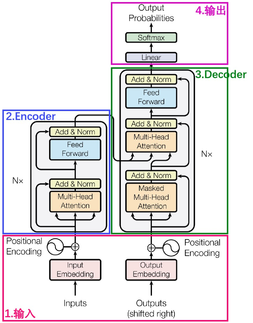 [`minicpm`](./model/modeling_minicpm.py)算法主要将转换成向量的分词用qkv自相关和全连接层提取特征,然后利用全连接层输出监督训练结果,本算法进行大量细节上的魔改组合,具体算法原理可参考下图原始transformer模型结构右侧decoder部分进行理解。