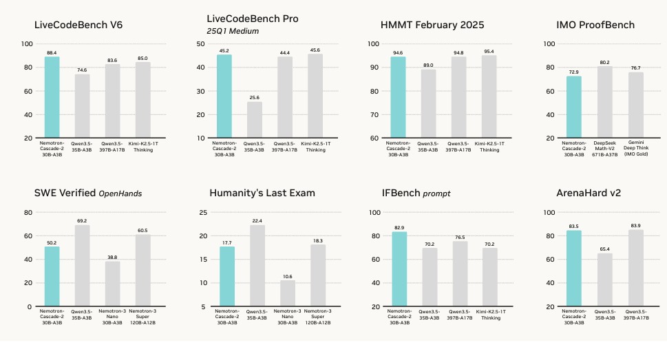 # Nemotron-Cascade 2 ## 论文 [Nemotron-Cascade 2: Post-Training LLMs with Cascade RL and Multi-Domain On-Policy Distillation](https://arxiv.org/abs/2603.19220) ## 模型简介 我们很高兴地推出Nemotron-Cascade-2-30B-A3B,这是一个拥有300亿参数的开源混合专家(MoE)模型,其激活参数为30亿,具备强大的推理和智能体能力。该模型是基于Nemotron-3-Nano-30B-A3B-Base进行后期训练得到的。Nemotron-Cascade-2-30B-A3B在2025年国际数学奥林匹克竞赛(IMO)和国际信息学奥林匹克竞赛(IOI)中均取得了金牌级别的优异成绩。它支持思考模式和指导(非思考)模式两种运行方式。