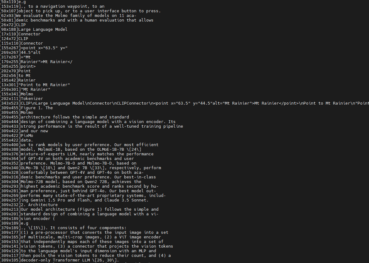 # olmocr ## 论文 [olmOCR: Unlocking Trillions of Tokens in PDFswithVisionLanguageModels](https://olmocr.allenai.org/papers/olmocr.pdf) ## 模型结构 olmOCR结合文档锚定(document-anchoring)技术与Qwen2-VL-7B-Instruct(阿里多模态模型),支持处理多种类型的PDF文档,包括学术论文、书籍、表格和图表等。olmOCR基于提取文档中的文本和布局信息,与页面图像结合,更准确地提取内容、保留结构化信息。
