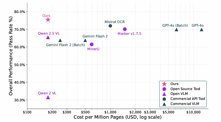 # olmOCR ## 论文 [olmOCR: Unlocking Trillions of Tokens in PDFswithVisionLanguageModels](https://olmocr.allenai.org/papers/olmocr.pdf) ## 模型简介 这是一个olmOCR模型的发布版本,它基于Qwen2.5-VL-7B-Instruct模型,并使用olmOCR-mix-1025数据集进行了微调。此外,该模型还采用了GRPO强化学习训练,以提升其在数学公式、表格以及其他复杂OCR场景下的性能。olmOCR与一系列用于PDF线性化和内容提取的方法在性能与成本方面的对比如下: