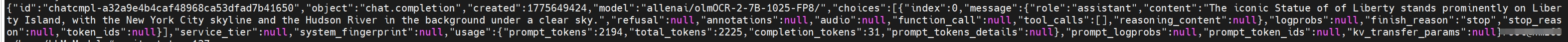 ## 环境依赖 | 软件 | 版本 | | :------: | :------: | | DTK | 26.04 | | python | 3.10.12 | | torch | 2.5.1+das.opt1.dtk2604 | | transformers | 4.57.6 | | vllm | 0.11.0+das.opt1.rc4.dtk2604 | 推荐使用镜像: harbor.sourcefind.cn:5443/dcu/admin/base/vllm:0.11.0-ubuntu22.04-dtk26.04-py3.10 - 挂载地址`-v`根据实际模型情况修改 ```bash docker run -it \ --shm-size 200g \ --network=host \ --name olmOCR \ --privileged \ --device=/dev/kfd \ --device=/dev/dri \ --device=/dev/mkfd \ --group-add video \ --cap-add=SYS_PTRACE \ --security-opt seccomp=unconfined \ -u root \ -v /opt/hyhal/:/opt/hyhal/:ro \ -v /path/your_code_data/:/path/your_code_data/ \ harbor.sourcefind.cn:5443/dcu/admin/base/vllm:0.11.0-ubuntu22.04-dtk26.04-py3.10 bash ``` 更多镜像可前往[光源](https://sourcefind.cn/#/service-list)下载使用。 ## 数据集 `暂无` ## 训练 `暂无` ## 推理 ### vllm #### 单机推理 ```bash ## serve启动 vllm serve allenai/olmOCR-2-7B-1025-FP8/ --trust-remote-code -tp 1 --port 8010 ## client访问 curl -X POST "http://localhost:8010/v1/chat/completions" \ -H "Content-Type: application/json" \ --data '{ "model": "allenai/olmOCR-2-7B-1025-FP8/", "messages": [ { "role": "user", "content": [ { "type": "text", "text": "Describe this image in one sentence." }, { "type": "image_url", "image_url": { "url": "https://cdn.britannica.com/61/93061-050-99147DCE/Statue-of-Liberty-Island-New-York-Bay.jpg" } } ] } ] }' ``` ## 效果展示
