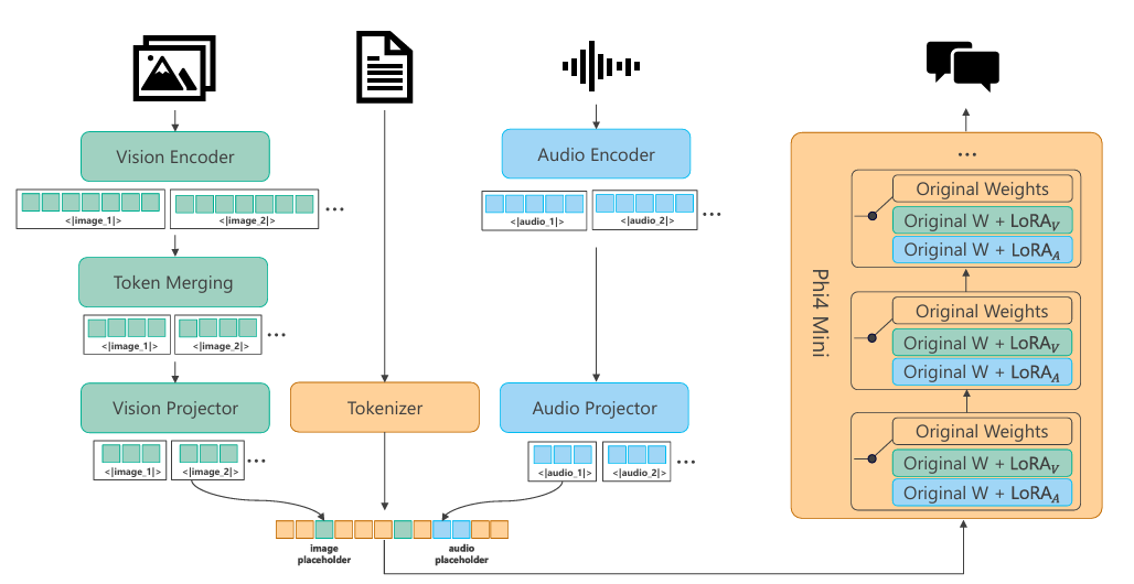 Phi-4-多模态是一个混合了LoRAs的单一模型,包括在同一表示空间内同时处理的语音、视觉和语言。其结果是一个能够处理文本、音频和视频输入的统一模型——不需要复杂的管道或不同模态的单独模型。Phi-4-multimodal建立在提高效率和可扩展性的新架构之上。它包含了更大的词汇表以改进处理,支持多语言功能,并将语言推理与多模态输入集成在一起。