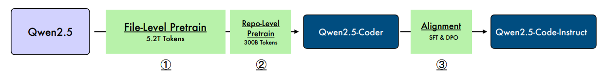 使用了三阶段的训练方法,以Qwen2.5作为BaseLine,第一阶段进行文本级别的训练,也就是上述的混合数据集共5.2T的Tokens,第二阶段是进行仓库级别的训练,增强模型的长文本处理能力,共300B的Tokens,通过两个阶段的训练,得到了Qwen2.5-Coder-Base模型;