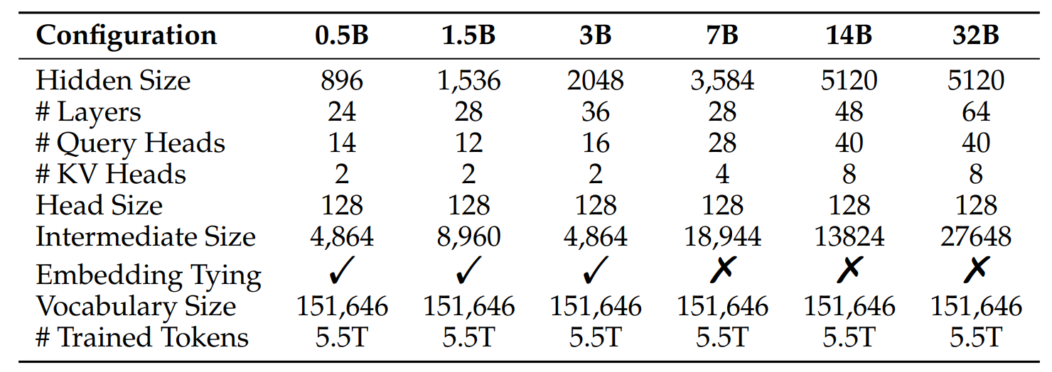 Qwen2.5-Coder以Qwen2.5为基础,有0.5B、1.5B、3B、7B、14B以及32B六个不同的模型尺寸,不同的尺寸的Head Size都为128,尺寸的变化主要体现在Hidden Size、Layers等结构尺寸的调整,具体的模型尺寸和结构如表所示: