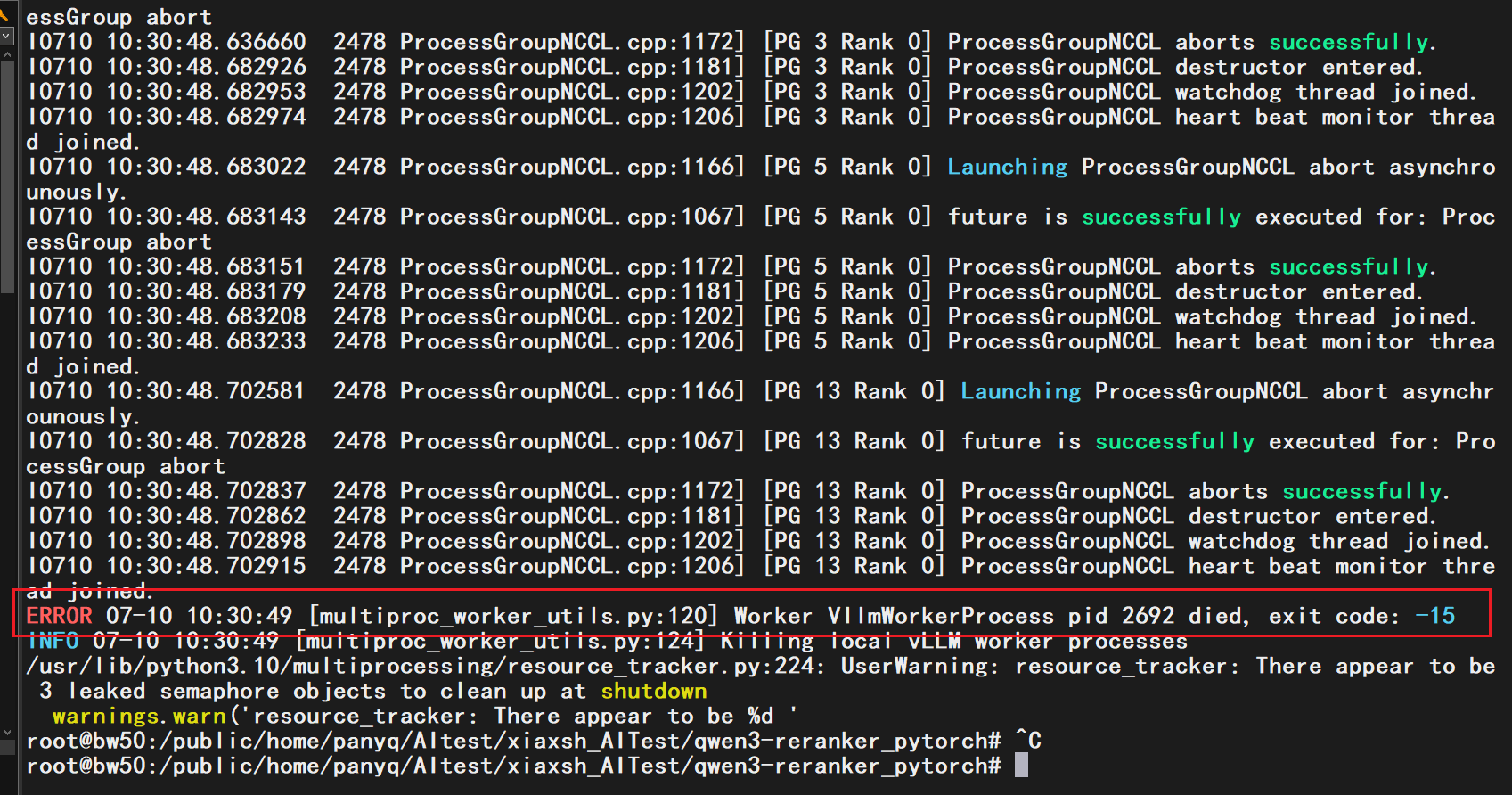 ERROR 07-10 10:30:49 [multiproc_worker_utils.py:120] Worker VllmWorkerProcess pid 2692 died, exit code: -15