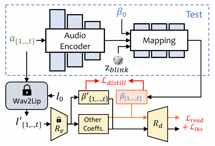 ## 算法原理 将 3DMM(3D Morphable Models)的运动系数看做中间表达,将整个任务划分成两部分。训练的时候会分模型训练,在推理的时候是 end-to-end 的模式: 1、从语音中生成更加真实的运动系数(如 head pose、lip motion、eye blink),并且每个系数是单独学习的,这样会解耦来降低不确定性: ExpNet:通过第一帧的 expression coefficient β 来将 expression motion 和 specific person 进行关联,为了降低在说话过程中其他面部部位的影响只使用 lip motion coefficient 作为 target coefficient 。其他不是很重要的面部动作(如眨眼)会使用额外的 landmark loss 来训练。