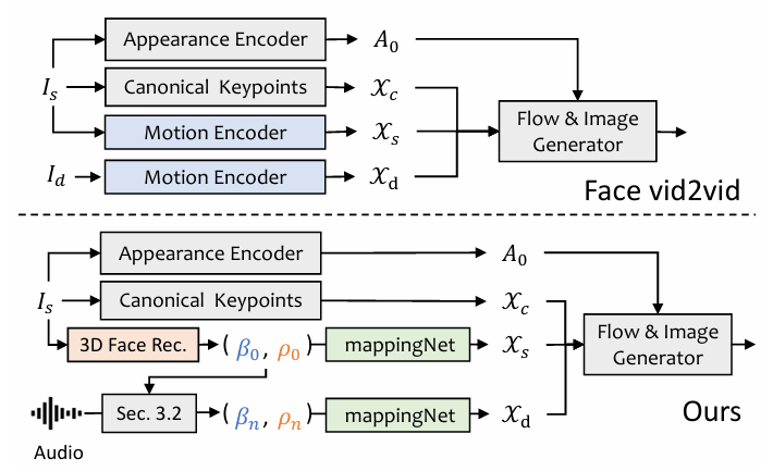 ## 算法原理 将 3DMM(3D Morphable Models)的运动系数看做中间表达,将整个任务划分成两部分。训练的时候会分模型训练,在推理的时候是 end-to-end 的模式: 1、从语音中生成更加真实的运动系数(如 head pose、lip motion、eye blink),并且每个系数是单独学习的,这样会解耦来降低不确定性: ExpNet:通过第一帧的 expression coefficient β 来将 expression motion 和 specific person 进行关联,为了降低在说话过程中其他面部部位的影响只使用 lip motion coefficient 作为 target coefficient 。其他不是很重要的面部动作(如眨眼)会使用额外的 landmark loss 来训练。