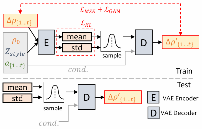 PoseVAE:训练时,pose VAE 在固定 n 帧上使用 encoder-decoder 的结构进行训练,encoder 和 decoder 输入包含连续的 t 帧 head pose ,且假设其服从高斯分布。decoder 中,网络学习的目标是从分布中通过采样来生成 t 帧 pose ,但不是直接生成 pose,而是学习和第一帧 pose ρ0 的残差,这样能保证生成的 pose 更连续、稳定、一致,所以也叫 conditional VAE,这里的 conditional 就是第一帧的 head pose。此外,还将每个声音的特征和 style identity 作为条件来作为 identity style。KL 散度用于衡量生成的 motion。MSE 和 GAN loss 用于保证生成的质量。