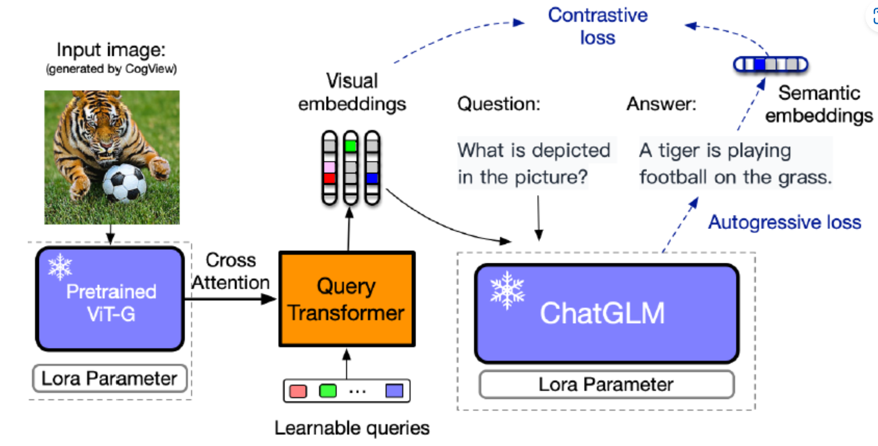 VisualGLM 模型架构是 ViT + QFormer + ChatGLM,在预训练阶段对 QFormer 和 ViT LoRA 进行训练,在微调阶段对 QFormer 和 ChatGLM LoRA 进行训练,训练目标是自回归损失(根据图像生成正确的文本)和对比损失(输入 ChatGLM 的视觉特征与对应文本的语义特征对齐)