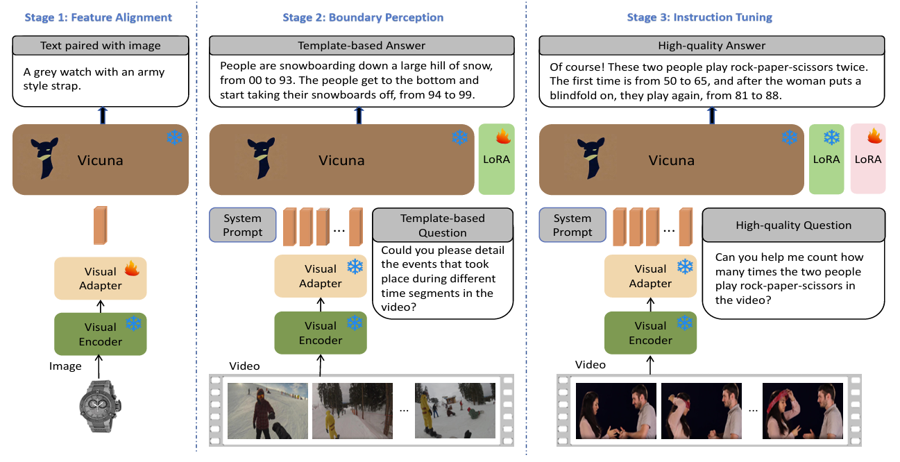 VTimeLLM有以下两个部分组成:1、一个视觉编码器和一个视觉适配器来处理输入视频;2、 一个特制的LLM过三阶段预训练来使模型同时具有grounding和chat能力