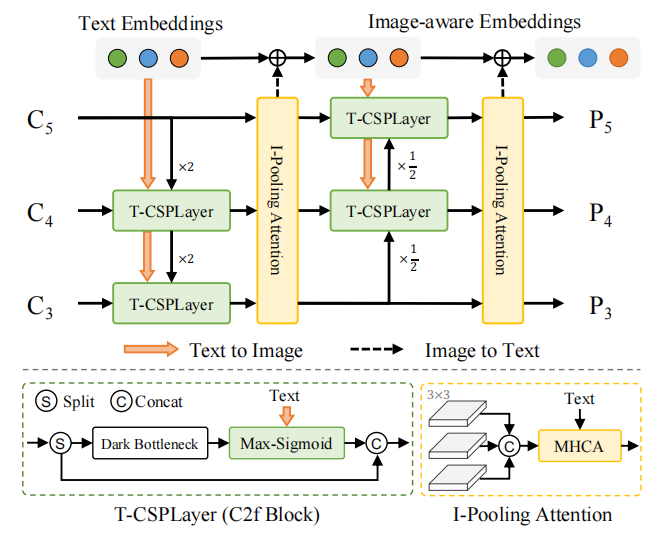 RepVL-PAN结构如下图,通过自顶向下和自底向上的方式,建立具有多尺度图像特征{C3, C4, C5}的特征金字塔{P3, P4, P5}。此外,提出了文本引导的CSPLayer(T-CSPLayer)和图像池化注意力((I-Pooling Attention)来进一步增强图像特征和文本特征之间的交互作用,从而提高开放词汇表的视觉语义表示能力。在推理过程中,可以将脱机词汇表嵌入重新参数化为卷积层或线性层的权重,以进行部署。