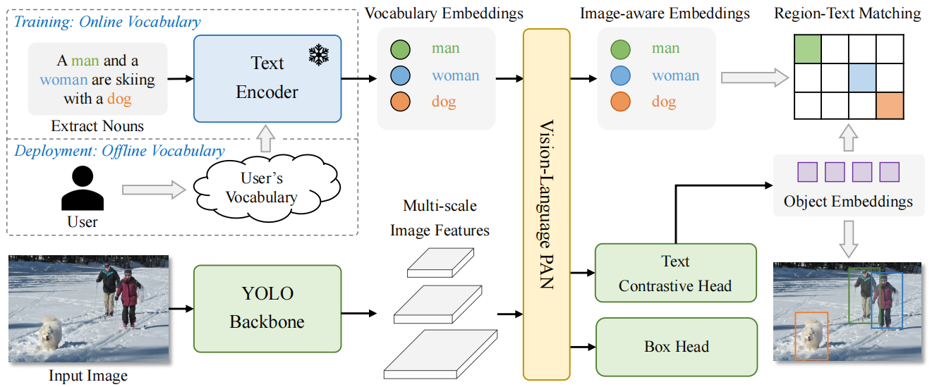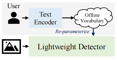 YOLO-World包含一个YOLO检测器、一个文本编码器和一个可重参数化的视觉-语言路径聚合网络(RepVL-PAN)。给定输入文本,YOLO-World中的文本编码器将其编码为文本嵌入向量。YOLO检测器中的图像编码器从输入图像中提取多尺度特征,然后利用RepVL-PAN通过利用图像特征和文本嵌入向量之间的跨模态融合来增强文本和图像的表示。在推理过程中,可以移除文本编码器,并将文本嵌入重新参数化为RepVL-PAN的权重,以实现高效部署。