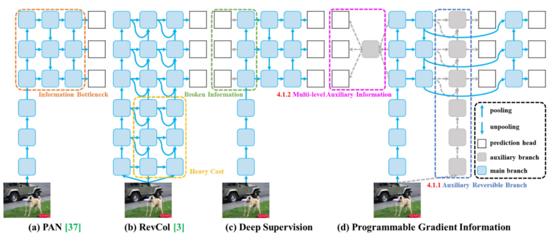 PGI主要包括三个组成部分,即:主分支, 辅助可逆分支, 多级辅助信息。PGI推理过程仅使用主分支,因此不需要任何额外的推理成本。