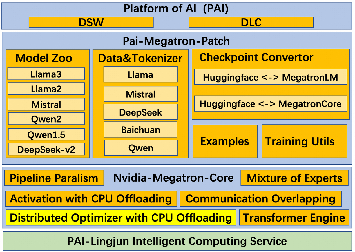 ## Quick Start | | Megatron-LM-Dense | Megatron-Core-Dense | Megatron-Core-MoE | MegaBlocks-MoE | |:------------|:--------------------------------------------------------------------------------------------------------------------:|:-----------------------------------------------------------------------------------------------------------------------:|:------------------------------------------------------------------------------------------------------------------------:|:-----------------------------------------------------------------------------------------------------------------:| | QwQ | N/A | [ReadMe](https://github.com/alibaba/Pai-Megatron-Patch/blob/main/examples/qwq/README.md#Megatron-Core模型训练流程) | N/A | N/A | | Qwen2.5-VL | N/A | [ReadMe](https://github.com/alibaba/Pai-Megatron-Patch/blob/main/examples/qwen2_5_vl/README.md#Megatron-Core模型训练流程) | N/A | N/A | | Moonlight | N/A | N/A | [ReadMe](https://github.com/alibaba/Pai-Megatron-Patch/blob/main/examples/moonlight/README.md#Megatron-Core-MoE模型训练流程) | N/A | | DeepSeek-V3 | N/A | N/A | [ReadMe](https://github.com/alibaba/Pai-Megatron-Patch/blob/main/examples/deepseek_v3/README.md#Megatron-Core-MoE模型训练流程) | N/A | | Qwen2-VL | N/A | [ReadMe](https://github.com/alibaba/Pai-Megatron-Patch/blob/main/examples/qwen2_vl/README.md#Megatron-Core模型训练流程) | N/A | N/A | LLaVA | N/A | [ReadMe](https://github.com/alibaba/Pai-Megatron-Patch/blob/main/examples/llava_mcore/README.md#Megatron-Core模型训练流程) | N/A | N/A | Qwen2.5 | N/A | [ReadMe](https://github.com/alibaba/Pai-Megatron-Patch/blob/main/examples/qwen2_5/README.md#Megatron-Core-Dense模型训练流程) | N/A | N/A | LLama3.1 | N/A | [ReadMe](https://github.com/alibaba/Pai-Megatron-Patch/blob/main/examples/llama3_1/README.md#Megatron-Core-Dense模型训练流程) | N/A | N/A | LLama3 | [ReadMe](https://github.com/alibaba/Pai-Megatron-Patch/blob/main/examples/llama3/README.md#Megatron-LM-Dense模型训练流程) | [ReadMe](https://github.com/alibaba/Pai-Megatron-Patch/blob/main/examples/llama3/README.md#Megatron-Core-Dense模型训练流程) | N/A | N/A | | LLama2 | [ReadMe](https://github.com/alibaba/Pai-Megatron-Patch/blob/main/examples/llama2/README.md#Megatron-LM-Dense模型训练流程) | [ReadMe](https://github.com/alibaba/Pai-Megatron-Patch/blob/main/examples/llama2/README.md#Megatron-Core-Dense模型训练流程) | N/A | N/A | | Mistral | [ReadMe](https://github.com/alibaba/Pai-Megatron-Patch/blob/main/examples/mistral/README.md#Megatron-LM-Dense模型训练流程) | [ReadMe](https://github.com/alibaba/Pai-Megatron-Patch/blob/main/examples/mistral/README.md#Megatron-Core模型训练流程) | [ReadMe](https://github.com/alibaba/Pai-Megatron-Patch/blob/main/examples/mistral/README.md#Megatron-Core模型训练流程) | N/A | | Qwen2 | N/A | [ReadMe](https://github.com/alibaba/Pai-Megatron-Patch/blob/main/examples/qwen2/README.md#Megatron-Core模型训练流程) | [ReadMe](https://github.com/alibaba/Pai-Megatron-Patch/blob/main/examples/qwen2/README_moe.md#Megatron-Core模型训练流程) | N/A | | Qwen1.5 | [ReadMe](https://github.com/alibaba/Pai-Megatron-Patch/blob/main/examples/qwen1_5/README.md#Megatron-LM-Dense模型训练流程) | [ReadMe](https://github.com/alibaba/Pai-Megatron-Patch/blob/main/examples/qwen1_5/README.md#Megatron-Core-Dense模型训练流程) | [ReadMe](https://github.com/alibaba/Pai-Megatron-Patch/blob/main/examples/qwen1_5/README.md#Megatron-Core-MoE模型训练流程) | [ReadMe](https://github.com/alibaba/Pai-Megatron-Patch/blob/main/examples/qwen1_5/README.md#MegaBlocks-MoE模型训练流程) | | DeepSeek-V2 | N/A | N/A | [ReadMe](https://github.com/alibaba/Pai-Megatron-Patch/blob/main/examples/deepseek_v2/README.md#Megatron-Core-MoE模型训练流程) | N/A | ## Introduction English | [简体中文](./README_zh-CN.md) Pai-Megatron-Patch (https://github.com/alibaba/Pai-Megatron-Patch) is a deep learning training toolkit built for developers to train and predict LLMs & VLMs by using Megatron framework easily. With the continuous development of LLMs, the model structure and scale are rapidly evolving. Although these models can be conveniently manufactured using Transformers or DeepSpeed training framework, the training efficiency is comparably low. This phenomenon becomes even severer when the model scale exceeds 10 billion. The primary objective of Pai-Megatron-Patch is to effectively utilize the computational power of GPUs for LLM. This tool allows convenient training of commonly used LLM with all the accelerating techniques provided by Megatron-LM. What's New: - **[Experimental]Support distributed checkpoint conversion for large LLM** [🔥🔥 2025.04.16] - **Upgrade DeepSeek-V3 SFT with fully Mcore implementation.** [🔥🔥 2025.03.31] - **Support training QwQ by using Megatron-Core.** [🔥🔥 2025.03.27] - **Support training Qwen2.5-VL by using Megatron-Core.** [🔥🔥 2025.03.21] - **Support training Moonlight-16B-A3B from Moonshot AI KIMI by using Megatron-Core.** [🔥🔥 2025.03.14] - **Optimize Checkpoint Conversion of DeepSeek-V3 and add support training with ETP** [🔥🔥 2025.03.14] - **Support training DeepSeek-V3 671B model by using Megatron-Core.** [🔥🔥 2025.02.21] - **Upgrade LLM SFT Training Process** [🔥🔥 2025.02.20] - **Upgrade DeepSeek-V2-MoE for facilitating a smooth transition to integrating the DeepSeek-V3-MoE.** [🔥🔥 2025.01.16] - **Upgrade Qwen2-VL models to support Sequence Parallel, VPP and TP-Comm-Overlap.** [🔥🔥 2025.01.15] - **Upgrade Qwen2-VL models to support MG2HF ckpts conversion and training with multi-turn complex multimodal samples.** [🔥🔥 2024.12.27] - **Support training Qwen2-VL models by using Megatron-Core.** [🔥🔥 2024.11.27] - **Support training LLaVA models by using Megatron-Core.** [🔥🔥 2024.11.20] - **Add llm auto configurator and apply per seq sft loss for qwen2/2.5 models.** [🔥🔥 2024.10.30] -