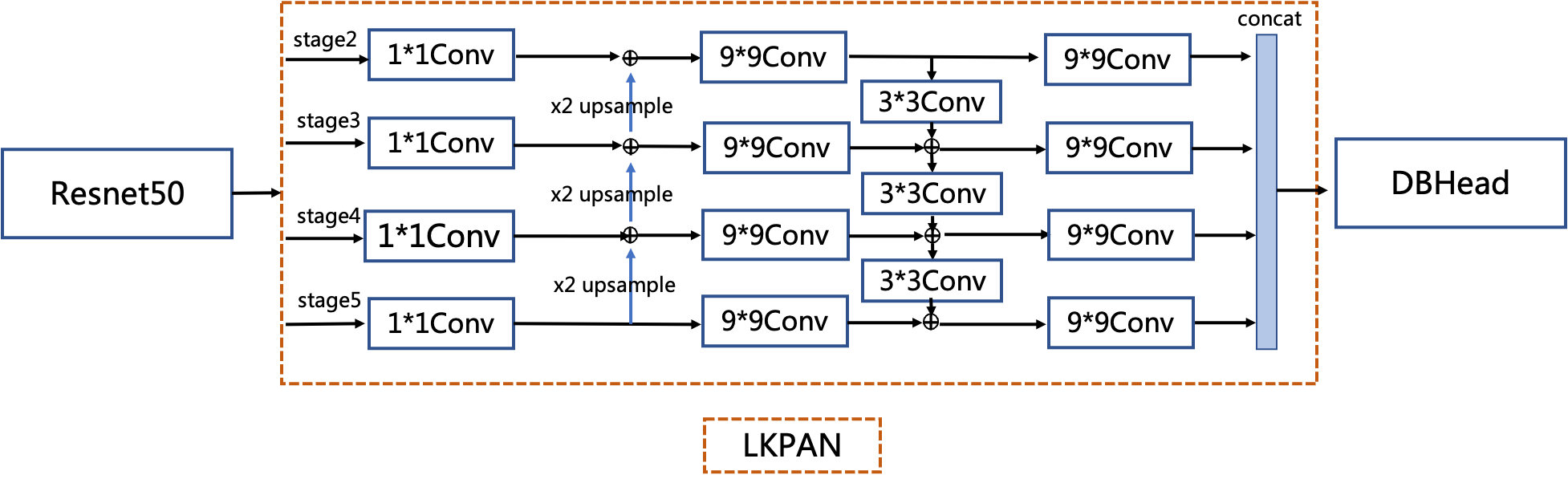 LK-PAN (Large Kernel PAN) is a lightweight [PAN](https://arxiv.org/pdf/1803.01534.pdf) structure with larger receptive field. The main idea is to change the convolution kernel size in the path augmentation of the PAN structure from `3*3` to `9*9`. By increasing the convolution kernel size, the receptive field of each position of the feature map is improved, making it easier to detect text in large fonts and text with extreme aspect ratios. Using LK-PAN, the hmean of the teacher model can be improved from 83.2% to 85.0%.