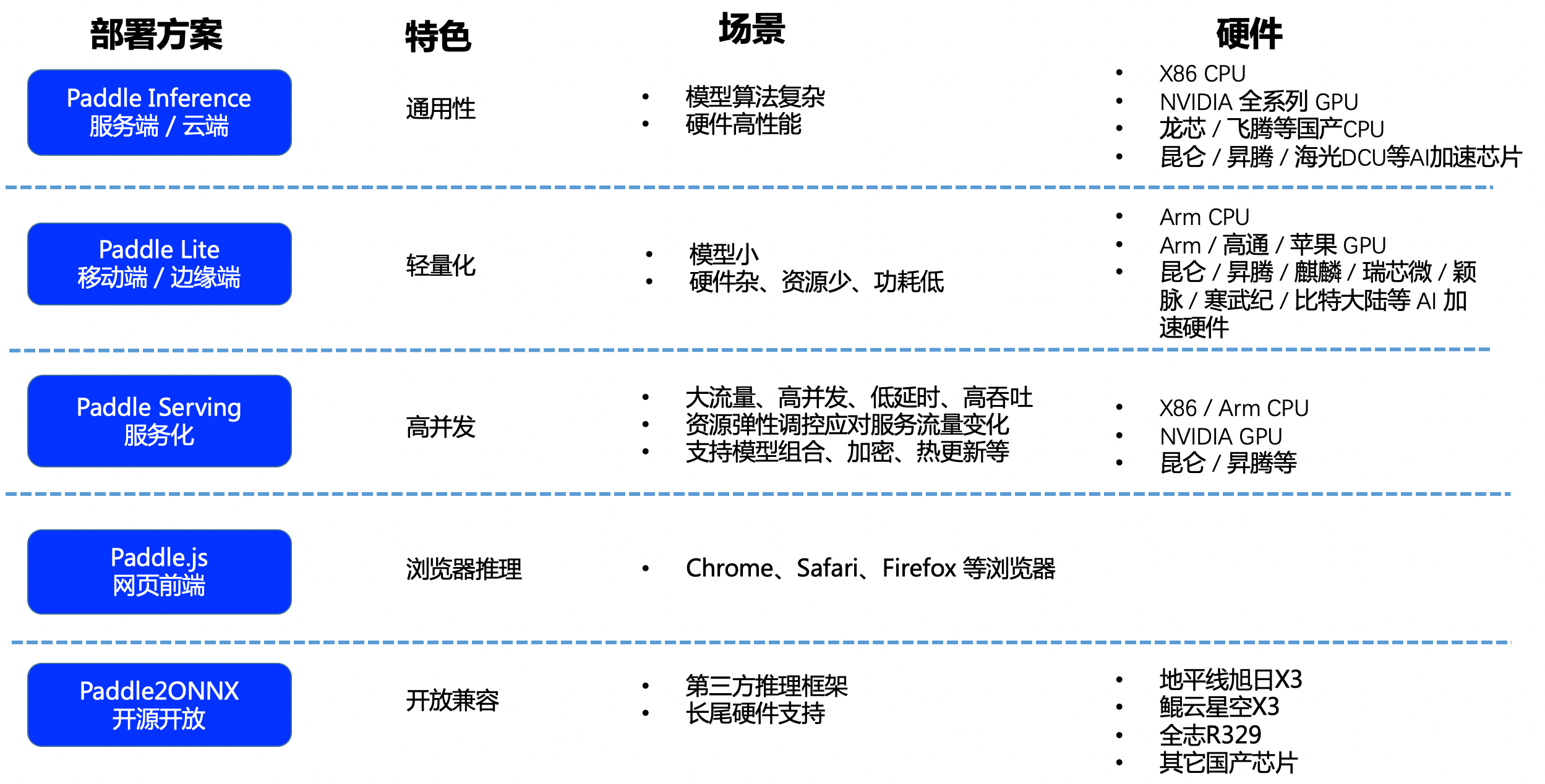 飞桨提供多种部署方案,以满足不同场景的部署需求,请根据实际情况进行选择: