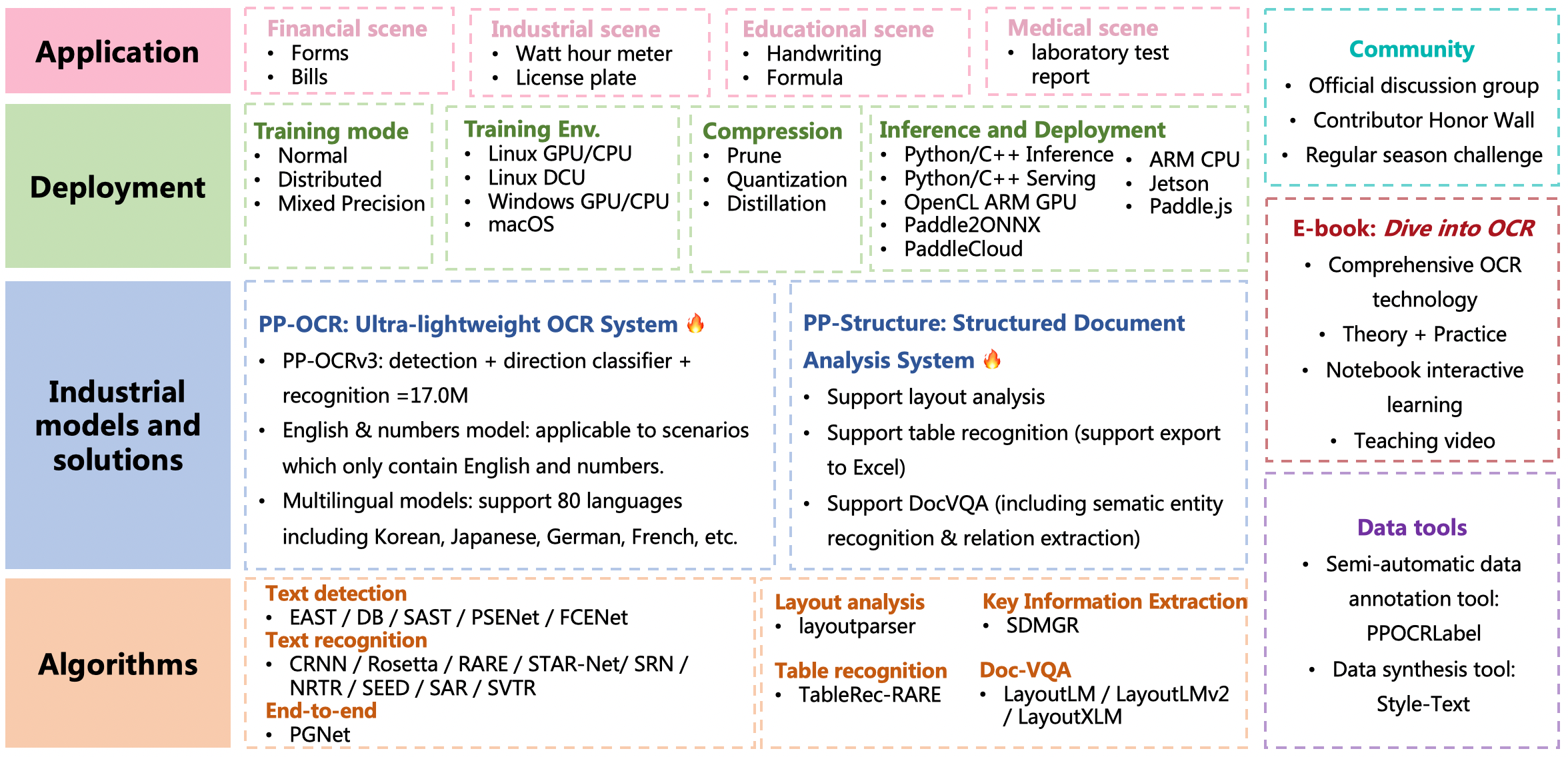 ## Recent updates - **🔥2022.7 Release [OCR scene application collection](./applications/README_en.md)** - PaddleOCR scene application covers general, manufacturing, finance, transportation industry of the main OCR vertical applications, including digital tube, LCD screen character, license plate, high-precision SVTR model, etc. **7 vertical models**. - **🔥2022.5.9 Release PaddleOCR [release/2.5](https://github.com/PaddlePaddle/PaddleOCR/tree/release/2.5)** - Release [PP-OCRv3](./doc/doc_en/ppocr_introduction_en.md#pp-ocrv3): With comparable speed, the effect of Chinese scene is further improved by 5% compared with PP-OCRv2, the effect of English scene is improved by 11%, and the average recognition accuracy of 80 language multilingual models is improved by more than 5%. - Release [PPOCRLabelv2](./PPOCRLabel): Add the annotation function for table recognition task, key information extraction task and irregular text image. - Release interactive e-book [*"Dive into OCR"*](./doc/doc_en/ocr_book_en.md), covers the cutting-edge theory and code practice of OCR full stack technology. - 2021.12.21 Release PaddleOCR [release/2.4](https://github.com/PaddlePaddle/PaddleOCR/tree/release/2.4) - Release 1 text detection algorithm ([PSENet](./doc/doc_en/algorithm_det_psenet_en.md)), 3 text recognition algorithms ([NRTR](./doc/doc_en/algorithm_rec_nrtr_en.md)、[SEED](./doc/doc_en/algorithm_rec_seed_en.md)、[SAR](./doc/doc_en/algorithm_rec_nrtr_en.md)). - Release 1 key information extraction algorithm [SDMGR](./ppstructure/docs/kie_en.md) and 3 [DocVQA](./ppstructure/vqa) algorithms (LayoutLM, LayoutLMv2, LayoutXLM). - 2021.9.7 Release PaddleOCR [release/2.3](https://github.com/PaddlePaddle/PaddleOCR/tree/release/2.3) - Release [PP-OCRv2](./doc/doc_en/ppocr_introduction_en.md#pp-ocrv2). The inference speed of PP-OCRv2 is 220% higher than that of PP-OCR server in CPU device. The F-score of PP-OCRv2 is 7% higher than that of PP-OCR mobile. - 2021.8.3 Release PaddleOCR [release/2.2](https://github.com/PaddlePaddle/PaddleOCR/tree/release/2.2) - Release a new structured documents analysis toolkit, i.e., [PP-Structure](./ppstructure/README.md), support layout analysis and table recognition (One-key to export chart images to Excel files). - [more](./doc/doc_en/update_en.md) ## Features PaddleOCR support a variety of cutting-edge algorithms related to OCR, and developed industrial featured models/solution [PP-OCR](./doc/doc_en/ppocr_introduction_en.md) and [PP-Structure](./ppstructure/README.md) on this basis, and get through the whole process of data production, model training, compression, inference and deployment. ![](./doc/features_en.png) > It is recommended to start with the “quick start” in the document tutorial ## Quick Experience - One line of code quick use: [Quick Start](./doc/doc_en/quickstart_en.md) - Web online experience for the ultra-lightweight OCR: [Online Experience](https://www.paddlepaddle.org.cn/hub/scene/ocr) - Mobile DEMO experience (based on EasyEdge and Paddle-Lite, supports iOS and Android systems): [Sign in to the website to obtain the QR code for installing the App](https://ai.baidu.com/easyedge/app/openSource?from=paddlelite) ## E-book: *Dive Into OCR* - [Dive Into OCR 📚](./doc/doc_en/ocr_book_en.md) ## Community👬 - For international developers, we regard [PaddleOCR Discussions](https://github.com/PaddlePaddle/PaddleOCR/discussions) as our international community platform. All ideas and questions can be discussed here in English. - For Chinese develops, Scan the QR code below with your Wechat, you can join the official technical discussion group. For richer community content, please refer to [中文README](README_ch.md), looking forward to your participation.