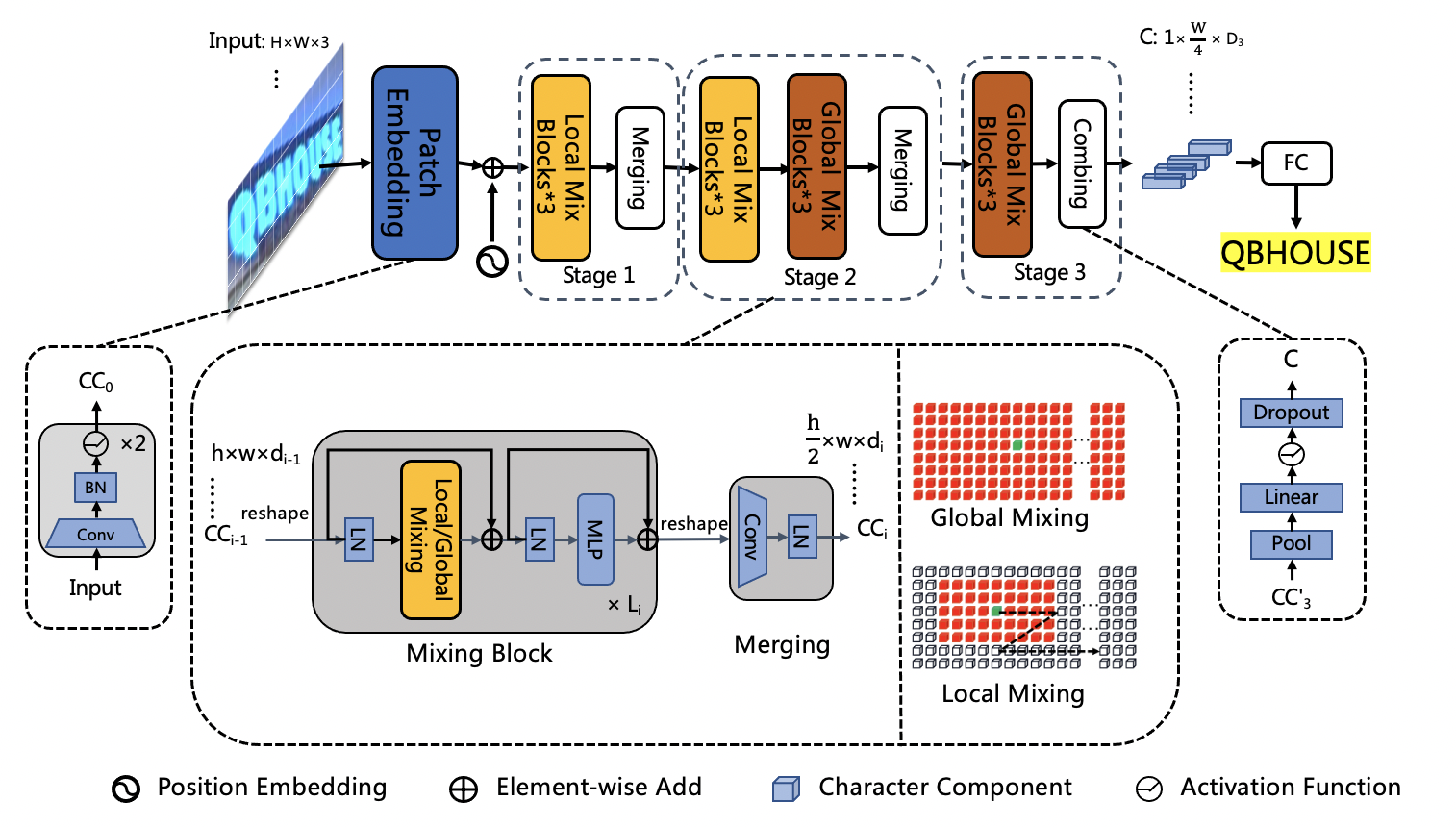 3. 实验发现 Global Mixing Block 的预测速度与输入其特征的shape有关,因此后移 Global Mixing Block 的位置到池化层之后,精度下降为71.9%,速度超越基于CNN结构的PP-OCRv2-baseline 22%,网络结构如下所示: