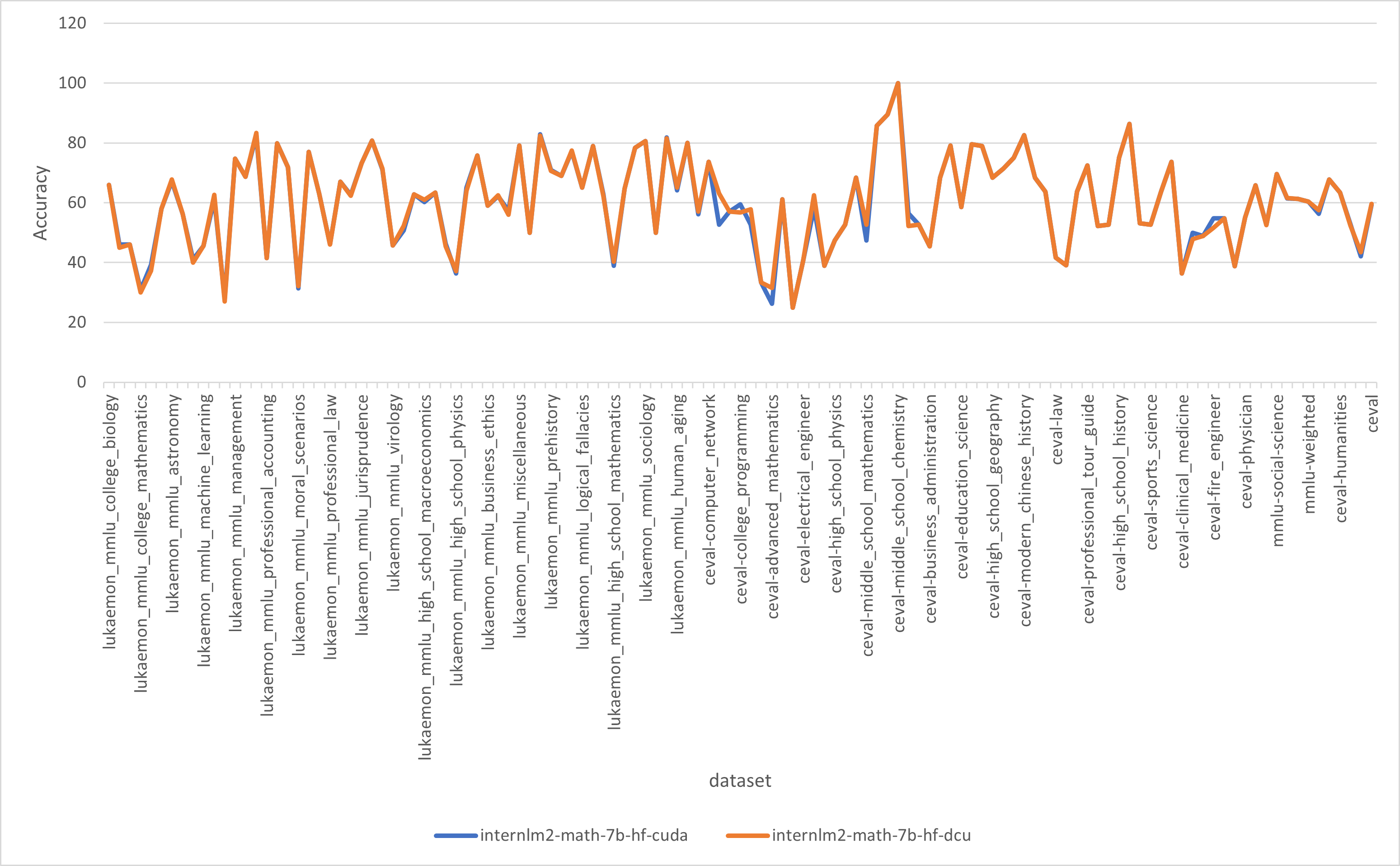### 精度 测试数据:[alpaca_en_demo.json],使用的加速卡:K100-64G,2卡训练。 根据测试结果情况填写表格: | device | train_loss | | :------: | :------: | | DCU-K100 | 1.0941 | | GPU-A800 | 1.0944 | 使用opencompass(https://github.com/open-compass/opencompass)得到的测试结果对比